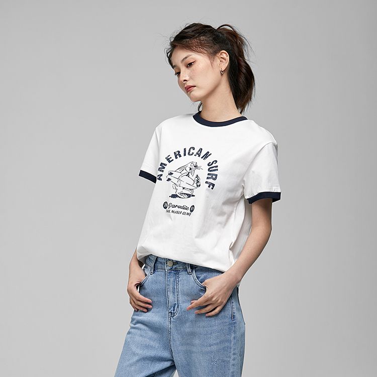 女士拼色边印花T恤